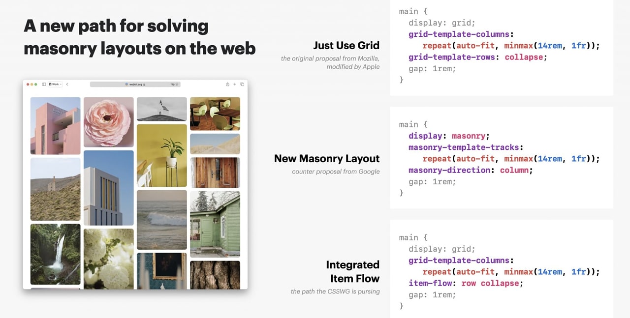 Item Flow: A New Unified Concept for Layout — You may recall all the debate around 'masonry' layouts in CSS and how best to implement them — now there's a third option in the mix. It’s one that “unifies the Jen Simmons (WebKit) |