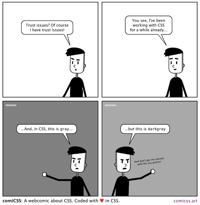 (The above comic comes from comiCSS by Alvaro Montoro – a webcomic that's both about CSS and coded with CSS.) |