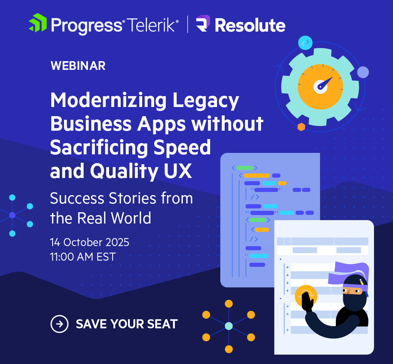 Free Webinar: Modernizing Legacy Business Apps Without Sacrificing Speed & Quality UX — Whether you’re tackling modernization at scale or fine-tuning your design system, this session shows how to keep speed, stability and UX quality in balance. In this joint webinar, Resolute & Progress will share real-world success stories from three enterprise modernization projects. Save your seat today! Progress Telerik sponsor |