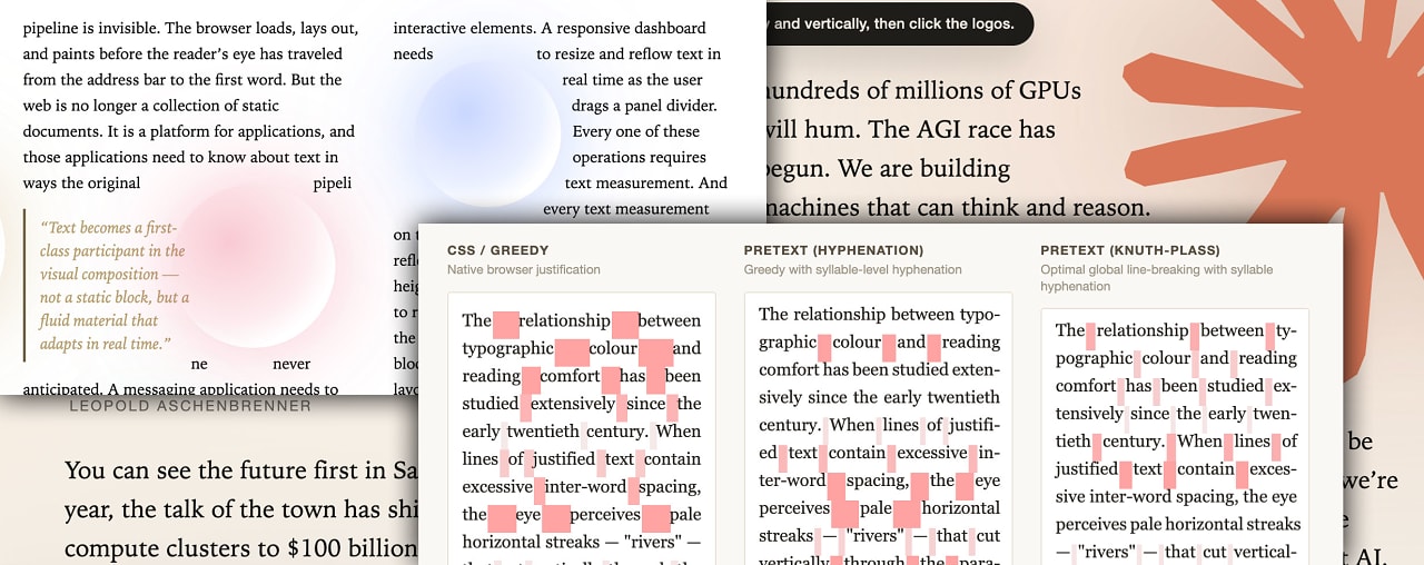 Pretext: A Multiline Text Measurement and Layout Library — This caused quite the stir this week, with some people even saying it'll redefine how layouts are made on the Web. Check out this dynamic layout demo for a taste. Essentially it opens the door to real-time, multiline text measurement and dynamic layouts, without touching the DOM. GitHub repo. Cheng Lou |